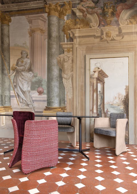 Anna è una poltrona a pozzetto su piedini o ruote completamente rivestita. Ideata dall' architetto Baciocchi.