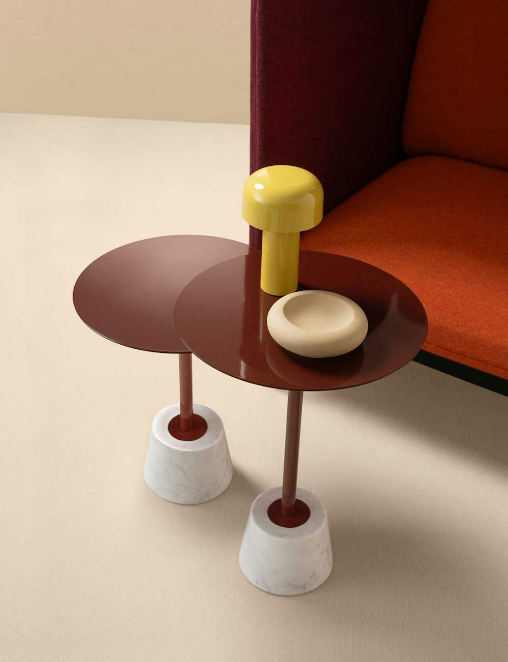 Pair of tables in two heights with white carrara marble base and black marquina base. Support top and painted metal stem.