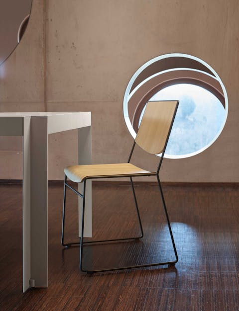Armchair able to connect the minimal design of the steel rod with the large and comfortable seat and backrest. The structure delimits the perimeter of the chair enhancing its shapes and ensuring a longer product life. Strength and stackability make it ideal for every use.