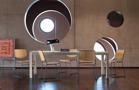 Cruise stands out for lightness and elegance thank to the seat and the backrest in wood (4 variants) and the chrome or black frame. The armchair in wood or polypropylene version can be completed with a hook for alignment in rows, a trolley and armrest with removable board.