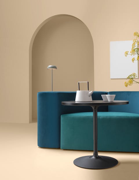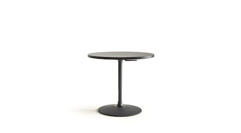 elevating table with HPL or melamine top and a sturdy circular-base structure. The lever just below the top allows hight regulation from 56 cm to 81 cm.