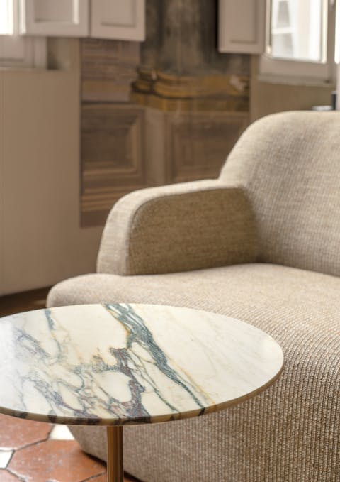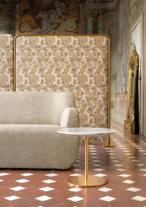 The base guarantees stability and is made of metal; it can be finished in different colors: chrome, gold, black or white. The top can be upholstered, in marble, in melamine, in hpl or painted.