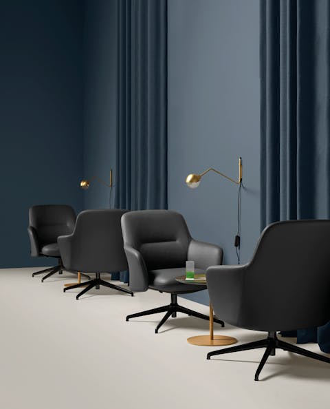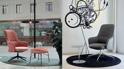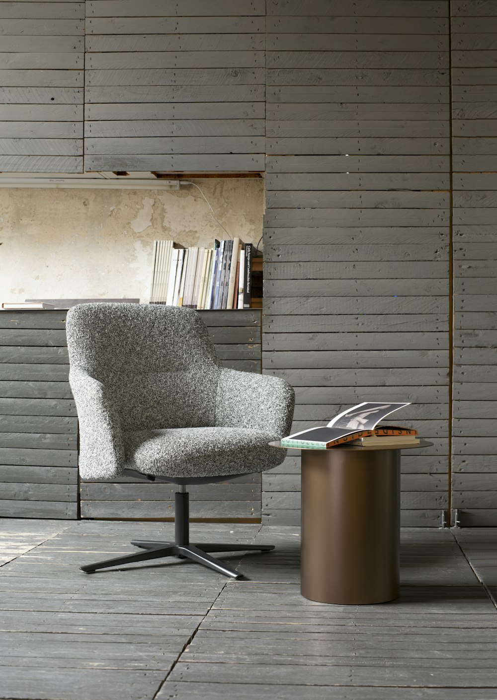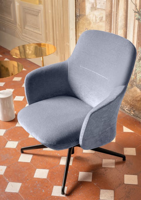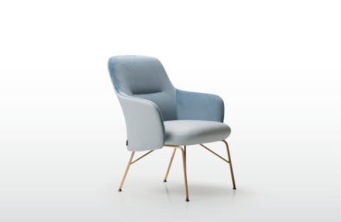 A lounge armchair with generous, comfortable, absolutely-essential shapes. Level can come with two heights, with a four-spoke aluminium base or metal framework. Syncron mechanism (four positions and integrated