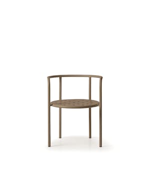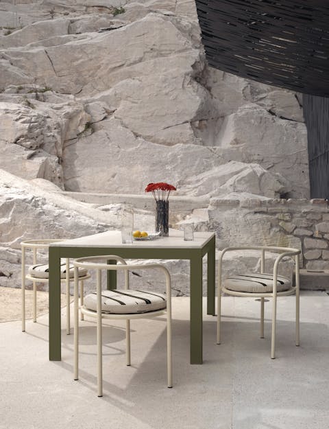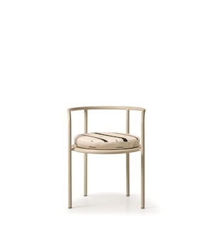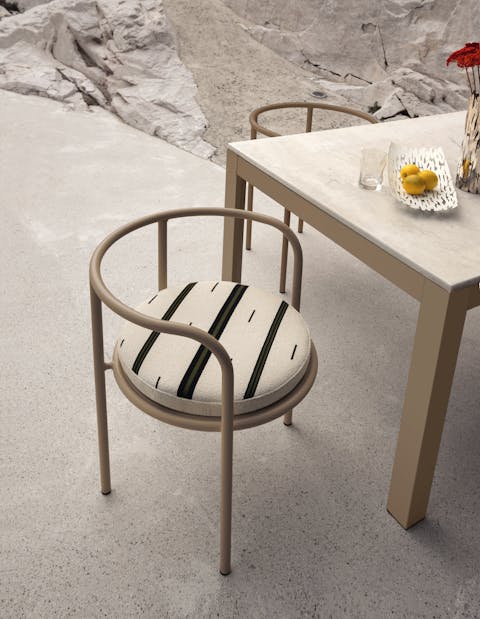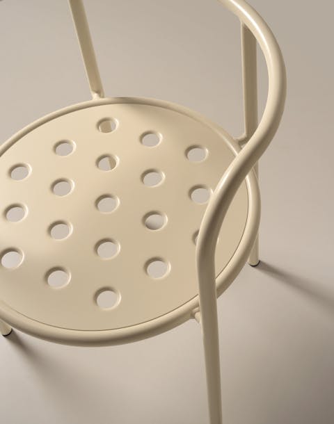 A vintage-style armchair with a seamless tubular metal frame, available in butter, anthracite, and dove gray. Its simple, refined shape draws inspiration from the concept of essential beauty. The enveloping backrest, the spacious perforated seat, and the removable cushion ensure comfort and versatility for both indoor and outdoor use.