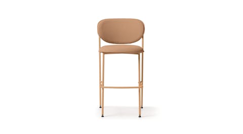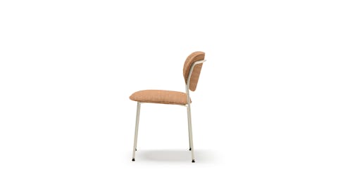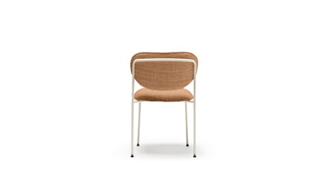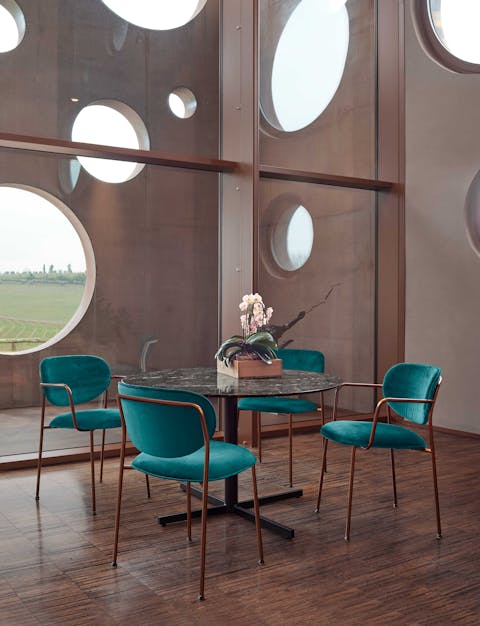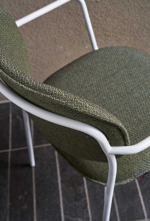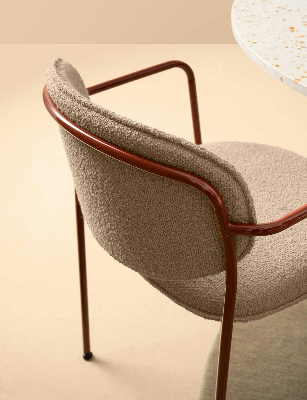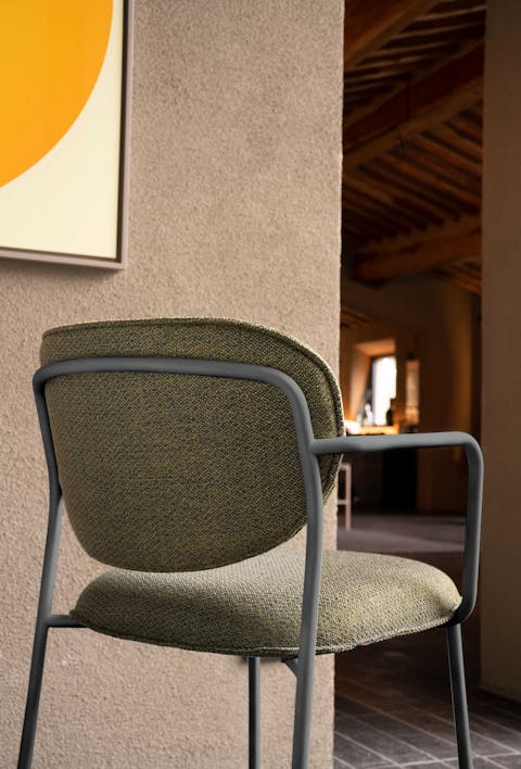 The sinuous shape of the upholstered backrest hugs and gives relief to the back of those who are seated ensuring a high level of comfort. The steel structure is essential and characterized by soft curves.