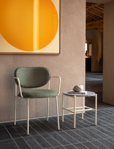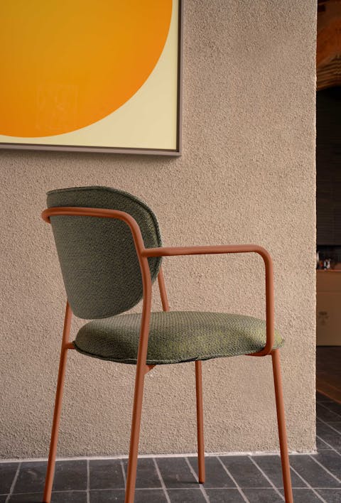 Armchair with simple design and elegant silhouette. The soft curves give it a unique personality and a friendly look. The feminine nature of its shapes make it ideal for private houses, restaurants and hotels, from the essential to the most refined.