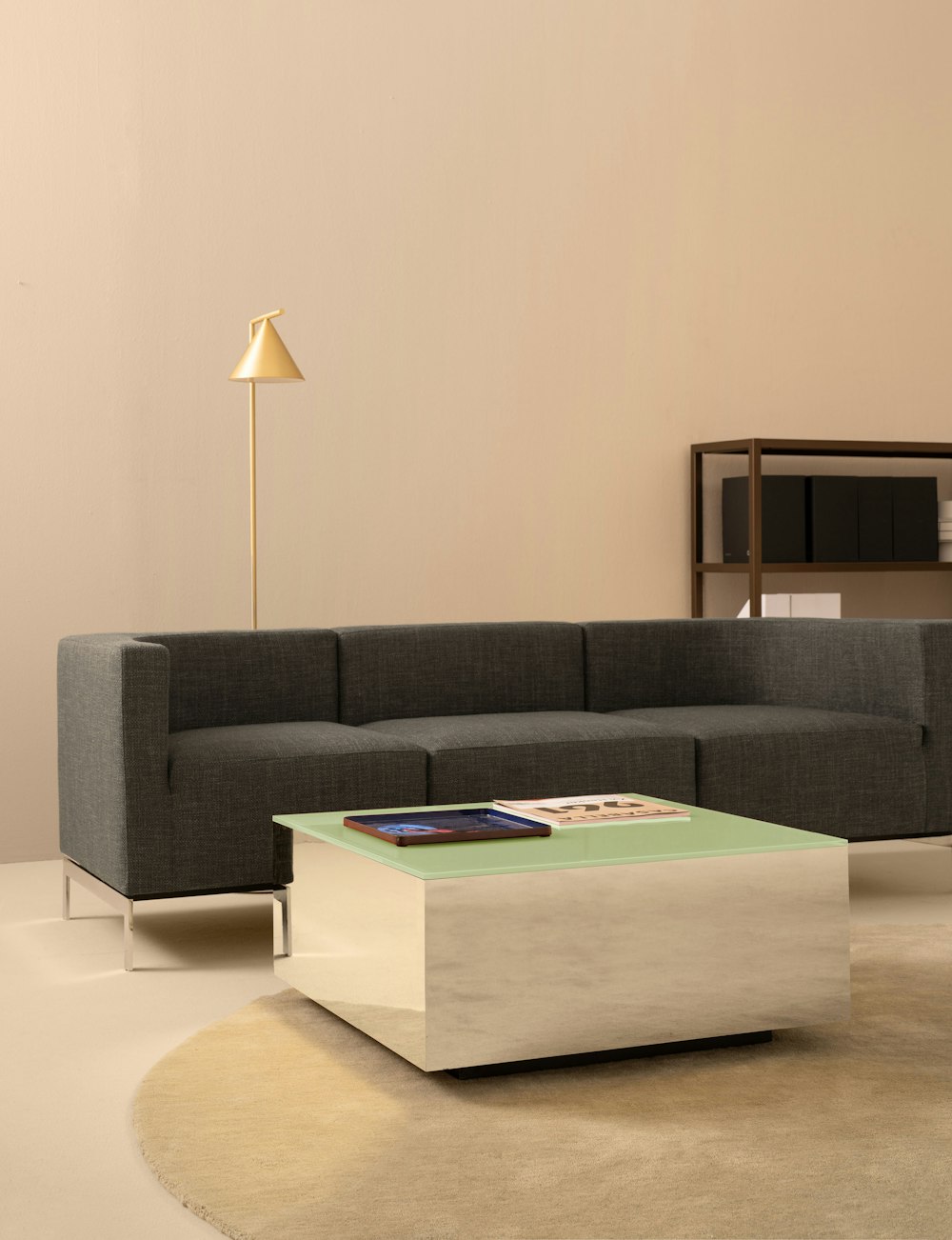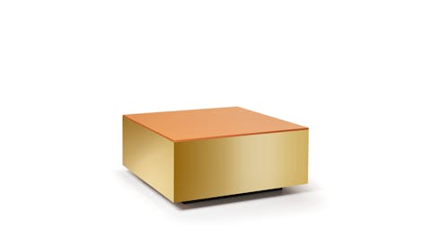 Monolithic table in glossy laminate, chromed or gold. Top in glass semi-transparent rust, greenish and chrome with mirror.