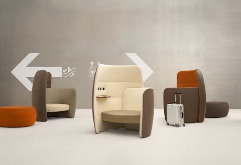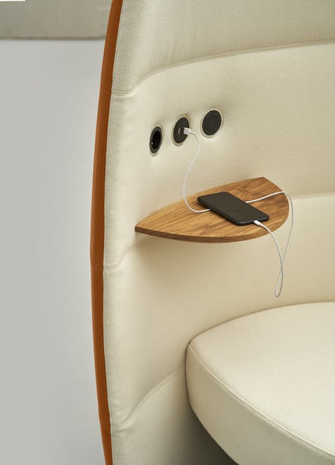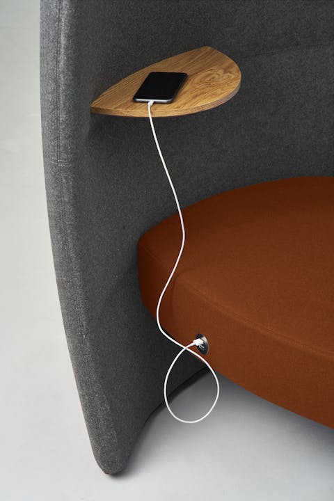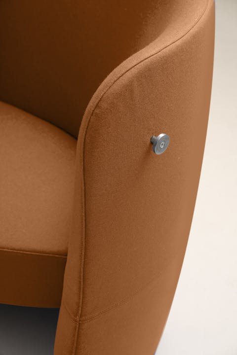 Two curved panels of a different height intertwine and create an original shell, inside which the wide seat and technological setup find space. Only Ju is an armchair designed for lounge and openspace areas.