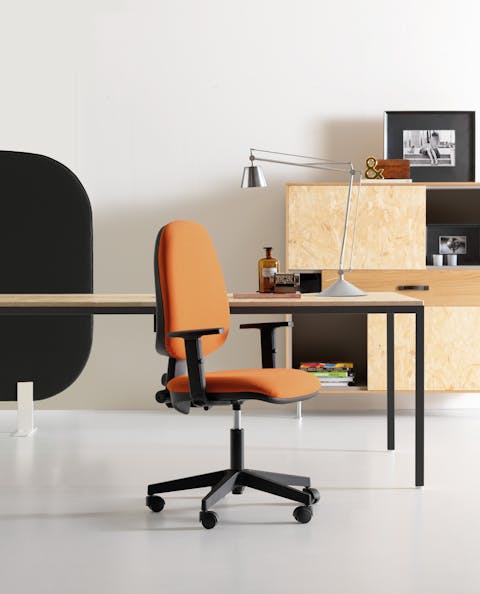 A task operative chair with a traditional design able to provide high standards of comfort. Equipped with a permanent- contact mechanism, a seat with two steel bars and gas-elevation system. Certified 1IM.