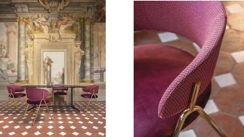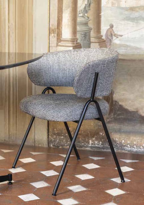 Keira ha sedile e spalliera interamente rivestiti. La struttura è verniciata o in galvanica.
