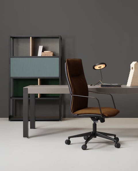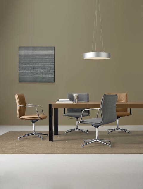 Poltrona disponibile nella versione con schienale alto e basso, base su ruote in alluminio lucido a 5 razze, cantilever con o senza bracciolo integrato. La versione con piastra girevole dotata di alzata a gas è ideale per meeting e fronte scrivania.
