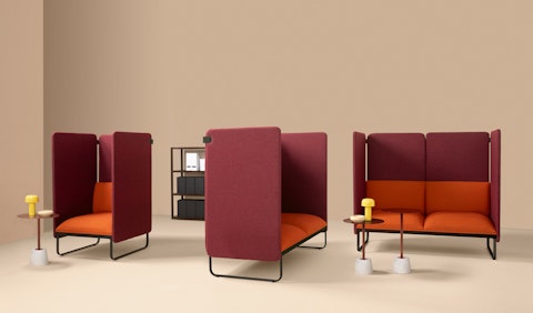 Loft X: Sistema modulare di poltrone e divani. Ogni modulo composto da seduta e schienale è rivestito e può essere montato su base con pannelli fonoassorbenti. La struttura può essere con braccioli in metallo o base metallica semplice.