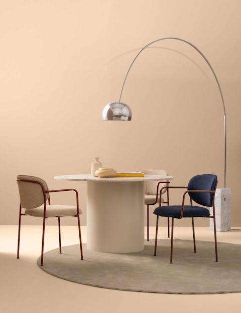 La forma sinuosa dello schienale rivestito abbraccia e dà sollievo alla schiena di chi è seduto garantendo un elevato livello di comfort. La struttura in acciaio è essenziale e caratterizzata da curve morbide.