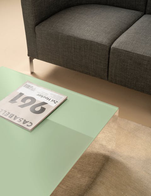 Tavolo monolitico in laminato lucido nei colori cromo e gold. Top in vetro semitrasparente ruggine, verde salvia e cromo con specchio.
