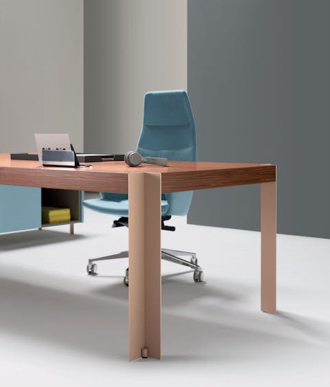 La personalità unica nasce dall'essenzialità della struttura realizzata con gambe metalliche a "L" e piani di elevato spessore, disponibili in essenza o rivestiti in pelle.