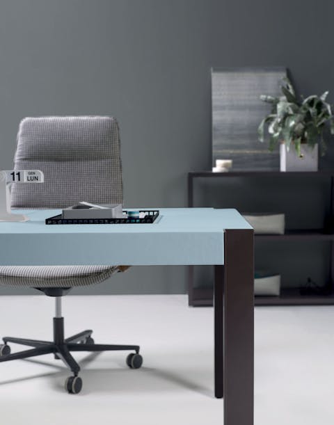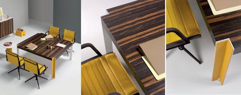 La personalità unica nasce dall'essenzialità della struttura realizzata con gambe metalliche a "L" e piani di elevato spessore, disponibili in essenza o rivestiti in pelle.