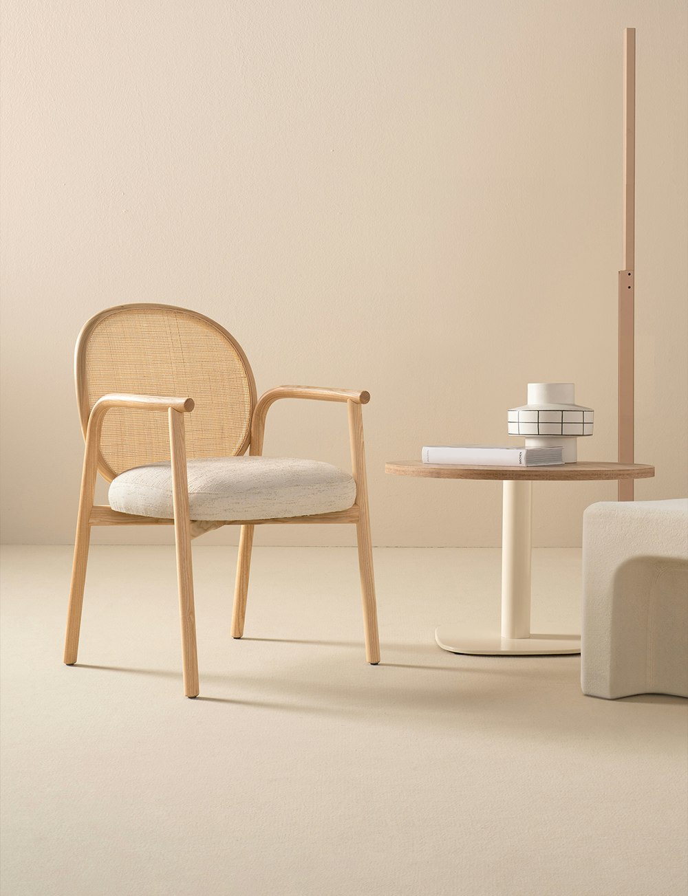 La struttura in legno di rovere dalla forma accogliente è prevista in finitura naturale o verniciata nero opaco con poro a vista. È disponibile una versione total black con paglia di Vienna in colore nero.