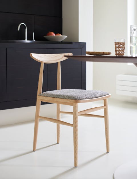 La struttura essenziale ed ispirata al design nordico, è verniciata nei colori nero a poro aperto, moka, noce, naturale e sedile rivestito in tutti i rivestimenti Quinti.