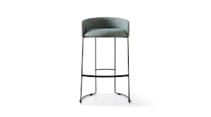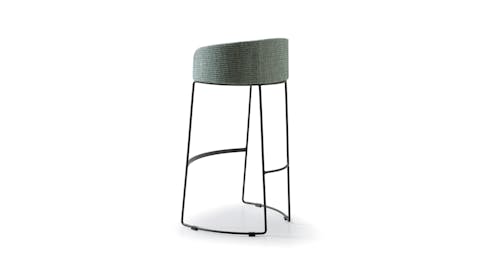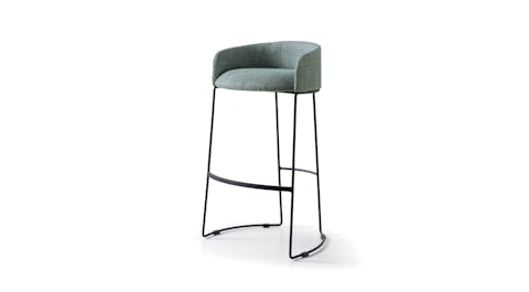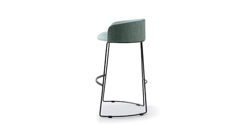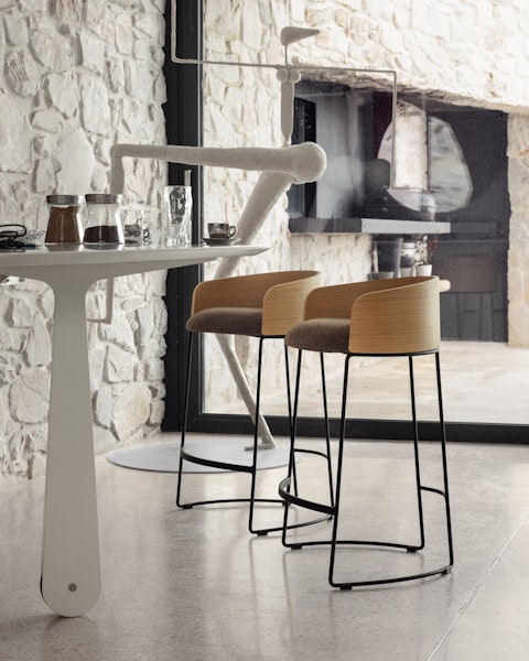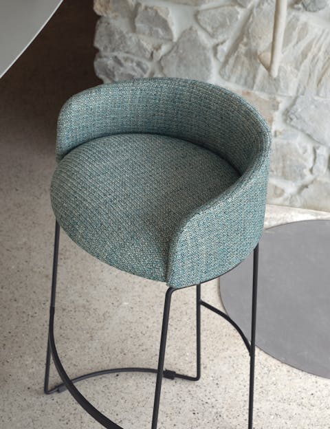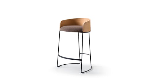 Sgabello dall’originale schienale curvo e dall’essenziale strut tura in tondino di acciaio con poggiapiedi. Lo schienale dalla forma avvolgente è previsto in essenza in 4 finiture legno o rivestito. Dis ponibile in due altezze lo sgabello è una presenza discreta e versatile capace di integrarsi sia in abitazioni private che in ristoranti, bar e hotel.
